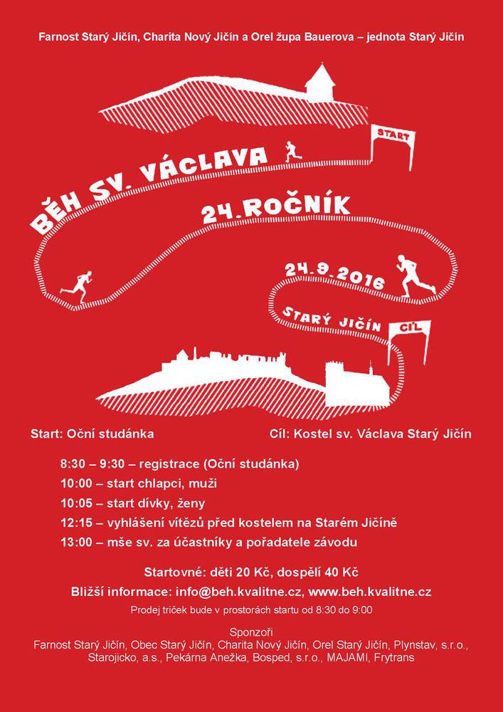 Orel Starý Jičín, Charita Nový Jičín a Farnost Starý Jičín zvou na 24.ročníku Běhu sv. Václava. Jako běžecký závod pro všechny věkové kategorie jej připravují na sobotu 24. září. Začínat se bude v 8:30 u Oční studánky, odkud se poběží ke kostelu sv. Václava na Starém Jičíně. Tam bude také od 13 hodin slavena mše sv. za účastníky a organizátory běhu sv. Václava.