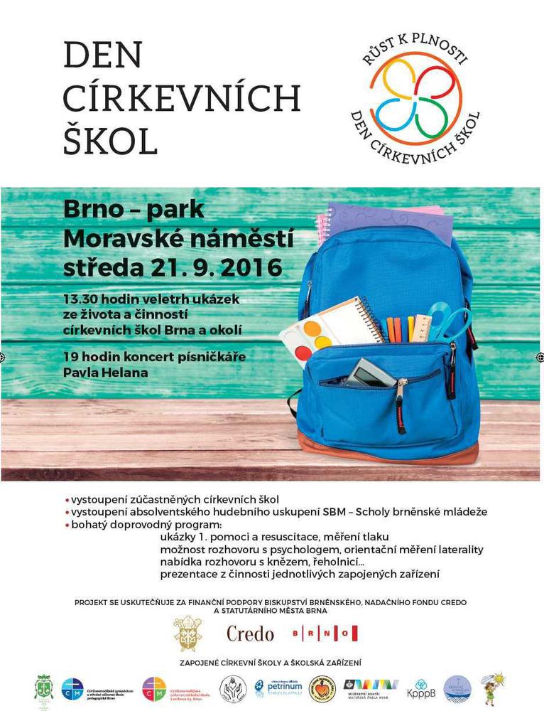 Ve středu (21. září) odpoledne bude Moravské náměstí v Brně hostit „Den církevních škol“. Tento veletrh ukázek ze života a činnosti škol se zde rozběhne ve 13:30. Program oživí vystoupení absolventského hudebního uskupení SBM a koncert písničkáře Pavla Helana, připravena jsou také rozhovory se zajímavými hosty, svědectví účastníků letošních Světových dnů mládeže, ukázky první pomoci a resuscitace, měření tlaku a laterality, možnost rozhovoru s psychologem i nabídka rozhovoru s knězem či řeholnicí.