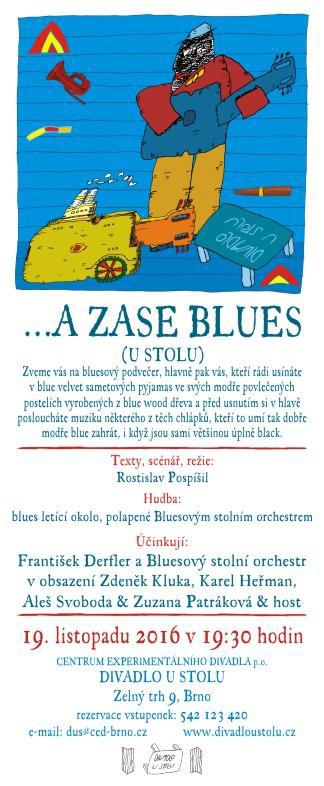 Z brněnského Divadla U stolu je pozvánka na bluesový podvečer připravovaný na sobotu (19. listopadu) na scéně Centra experimentálního divadla na Zelném trhu. Program nazvaný „… A zase blues (U stolu)“ nabídne od půl osmé večerní vystoupení Františka Derflera a Blusového stolního orchestru.
