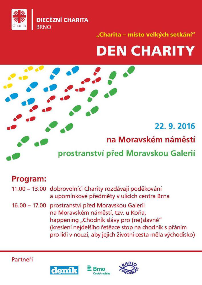 „Charita – místo velkých setkání“ s tímto heslem je na čtvrtek (22.9.) na Moravském náměstí v Brně připraven Den Charity. Jeho program se na prostranství před Moravskou Galerií rozběhne se čtvrtou odpolední, připraven je happening „Chodník slávy pro (ne)slavné“.