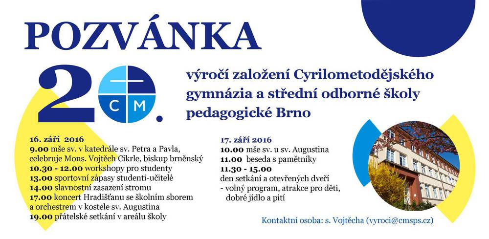 Cyrilometodějské gymnázium a střední odborná škola pedagogická Brno si připomíná 20 let od svého vzniku. Součástí oslav připravených na pátek a sobotu (16. a 17.9.) bude také slavnostní koncert Cimbálové muziky Hradišťan s Jiřím Pavlicou. Kostel sv. Augustina se jím rozezní od páteční 17. hodiny. V rámci večera se představí také školní orchestr a pěvecký sbor Cantate Brno.