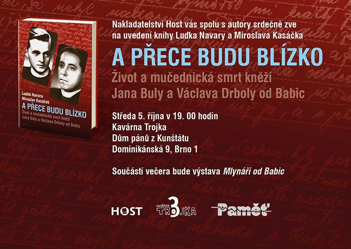 „A přece budu blízko“, tak se jmenuje nová kniha o životě a mučednické smrti kněží Jana Buly a Václava Drboly od Babic. Občanské sdružení Paměť zve na její zítřejší (5.10.) brněnské uvedení. Pozvání do Domu pánů z Kunštátu platí na sedmou večerní.