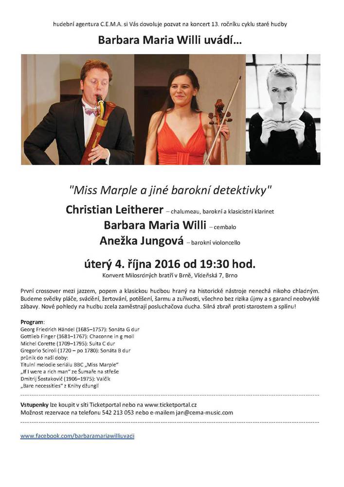 Brněnský Konvent Milosrdných bratří bude dnes (4.10.) hostit Zahajovací koncert 13. ročníku cyklu staré hudby „Barbara Maria Willi uvádí …“. Těšit se můžete na jazz, pop i klasickou hudbu hrané na historické hudební nástroje. Večer s titulem „Miss Marple a jiné barokní detektivky“ se rozběhne o půl osmé.