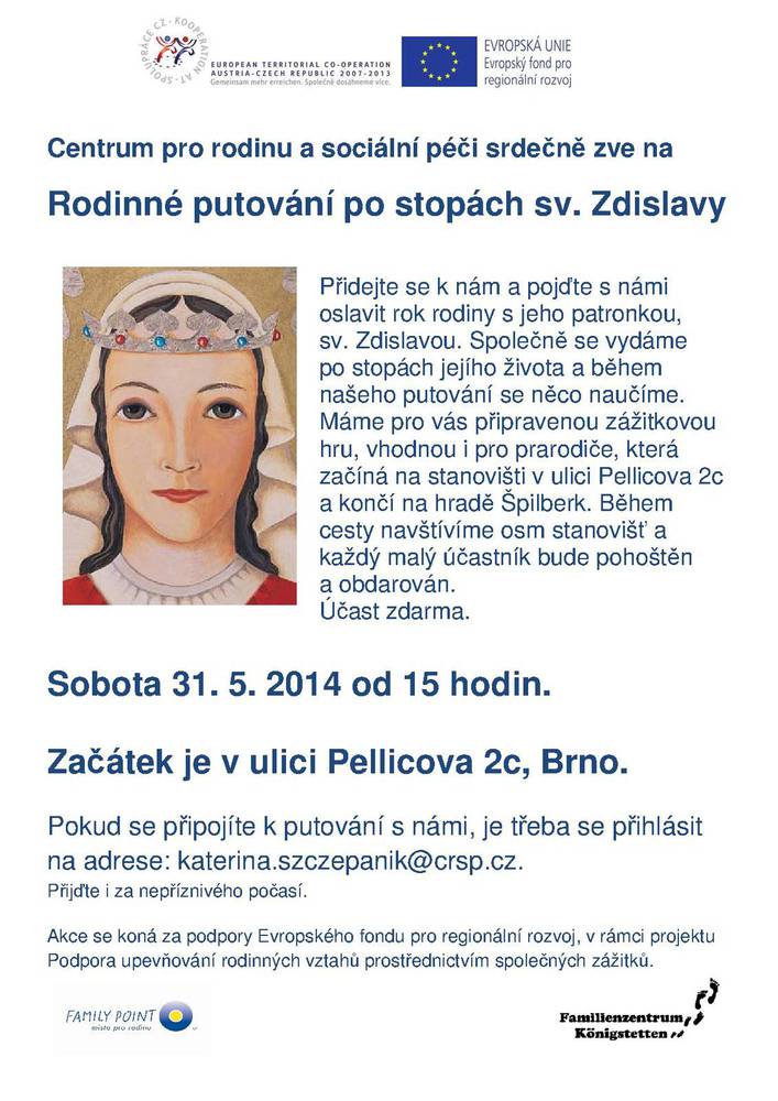 Brněnské Centrum pro rodinu a sociální péči srdečně zve na Rodinné putování po stopách sv. Zdislavy. Prožít je můžete v sobotu 31.5. od 15 hodin na cestě z Pellicovi ulice na hrad Špilberk. Při krátkém putování po stopách života patronky rodin čeká děti, rodiče i prarodiče zážitková hra. K putování po stopách sv. Zdislavy je dobré se přihlásit na adrese: katerina.szczepanik@crsp.cz.