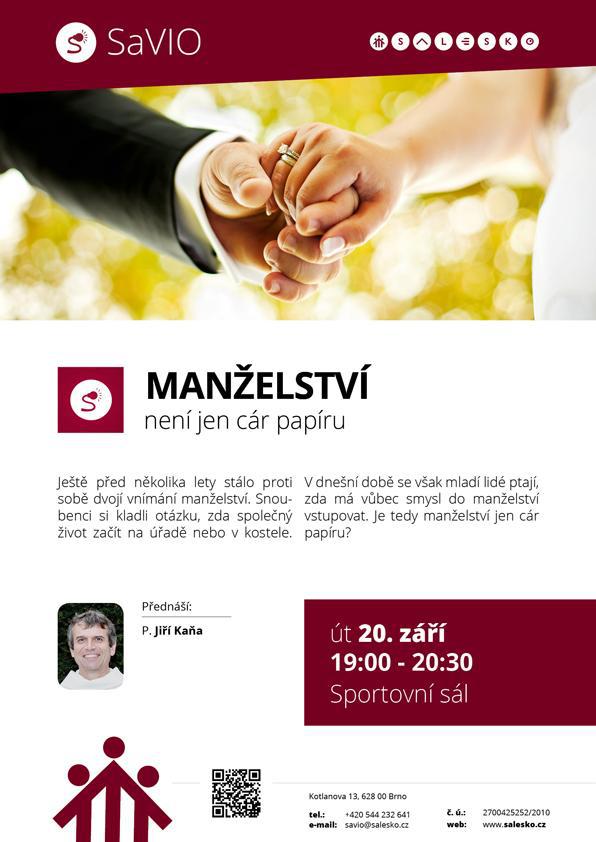 „Manželství není jen cár papíru“ to je titul zítřejšího (20.9.) pokračování cyklu besed, přednášek a vzdělávacích programů pro SaVIO salesiánského střediska v brněnské Líšni. Nejen o změně vnímání zde od 19 hodin promluví P. Jiří Kaňa.