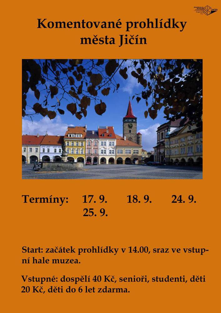 Komentované prohlídky města Jičín pak potěší nejen turisty, ale všechny zájemce o historii tohoto města. Zájemci budou seznámeni například s historií významných domů na náměstí, získají informace o postavení třech městských bran a s nimi souvisejícího městského opevnění, podívají se také do míst, kam byly v 17. století záměrně stěhovány jičínské židovské rodiny. Prohlídky se konají vždy od 14 hodin, sraz ve vstupní hale muzea.