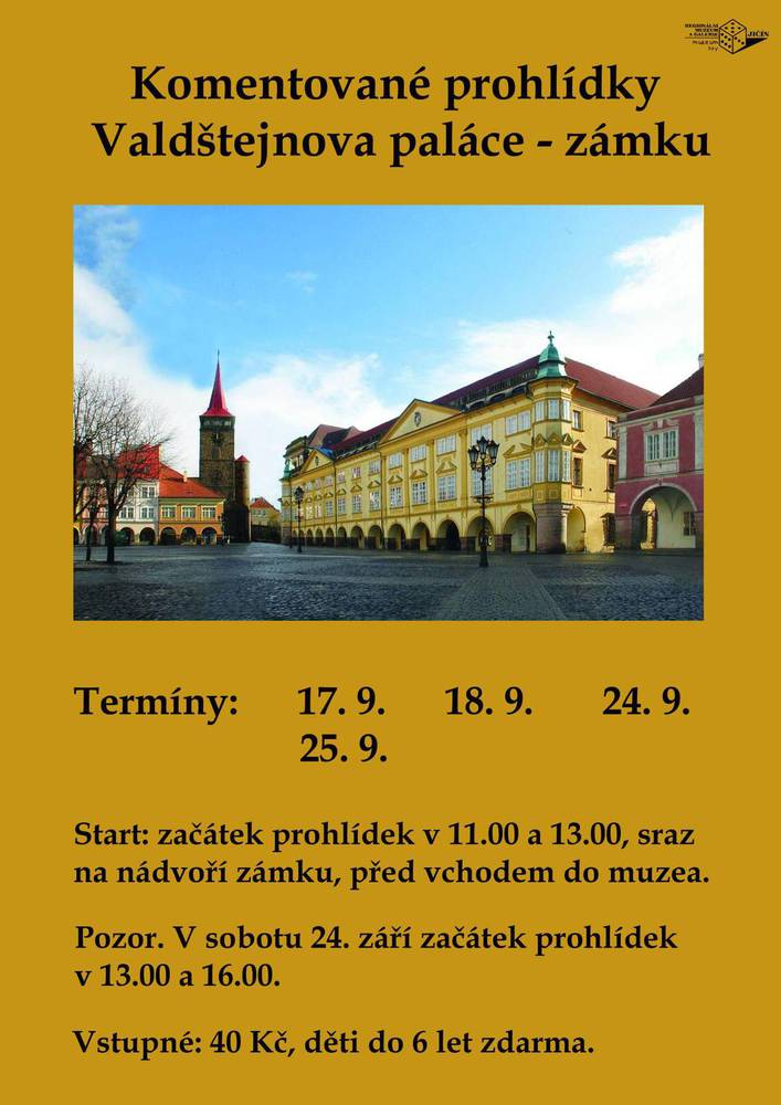 Komentované prohlídky Valdštejnova paláce – zámku jsou určeny pro ty, kteří chtějí detailněji poznat sídlo, které si pro sebe ve svém rezidenčním městě Jičíně - a současně hlavním městě svého frýdlantského vévodství – nechal vystavět Albrecht z Valdštejna. Prohlídky se konají vždy od 11 a 13 hodin, sraz na nádvoří zámku, před vchodem do muzea.