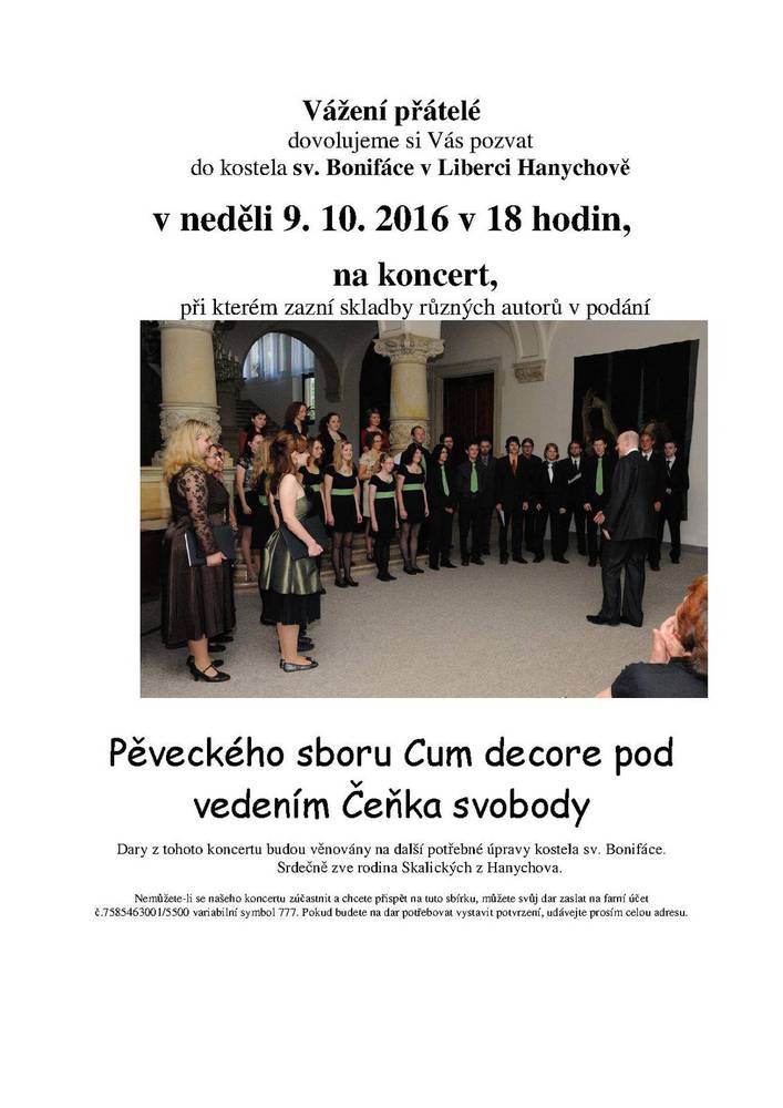 Na další z benefičních koncertů v kostele svatého Bonifáce v Liberci-Hanychově si můžete zajít už tuto neděli (9.10.) večer. Od 18 hodin se zde tentokráte představí pěvecký sbor Cum decore.