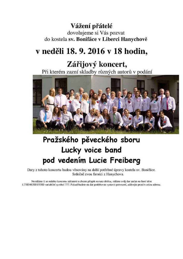 V neděli (18.9.) večer rozezní kostel svatého Bonifáce v Liberci-Hanychově další z benefičních koncertů ve prospěch dalších potřebných úprav chrámu. Pražský pěvecký sbor Lucky voice band si zde můžete poslechnout od 18 hodin.