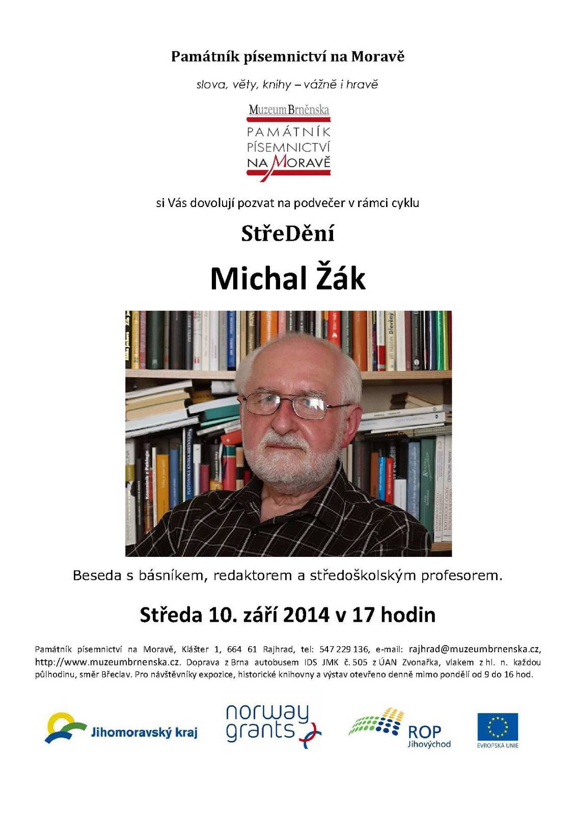 Po letní přestávce pokračuje tradiční besední pořad Památníku písemnictví na Moravě. Ve středu 10. září vás tak v areálu benediktinského kláštera v Rajhradě čeká setkání s básníkem Michalem Žákem. Ten v rámci besedy, která začne v 17 hodin, přečte ukázky nejen ze své nejnovější sbírky „V náruči čtvrtohor“.