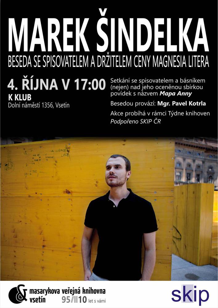 V rámci Týdne knihoven zve ta Masarykova ve Vsetíně na setkání s držitelem ceny Magnesia Litera Markem Šindelkou. Beseda se spisovatelem a básníkem (nejen) nad jeho oceněnou sbírkou povídek „Mapa Anny“ začne dnes (4.10.) v 17 hodin v K klubu. Na čtvrtek (6.10.) pak vsetínská klubovna slibuje setkání se spisovatelkou Ivou Pekárkovou.
