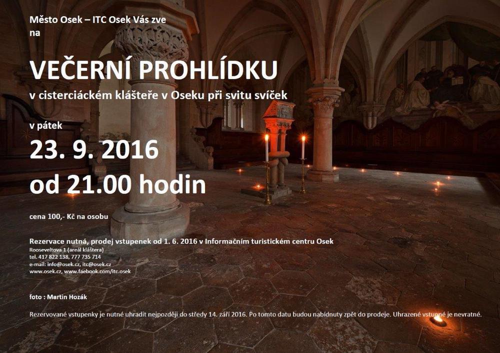 Do Oseka je pozvání na páteční (23.9.) Večerní prohlídku v tamním cisterciáckém klášteře při svitu svíček. Na prohlídky, které začnou v 21 hodin je třeba se předem objednat, nejlépe na telefonu 417 822 138.