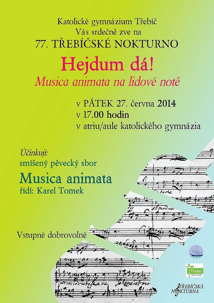 Na poslední pátek školního roku (27. června) připravili organizátoři Třebíčských nokturen netradiční koncert. V atriu/aule Katolického gymnázia v Třebíči se od 17 hodin představí smíšený pěvecký sbor Musica animata. Ten ve druhé polovině koncertu ukáže, že mu rozhodně nejsou cizí ani lidové písně.
