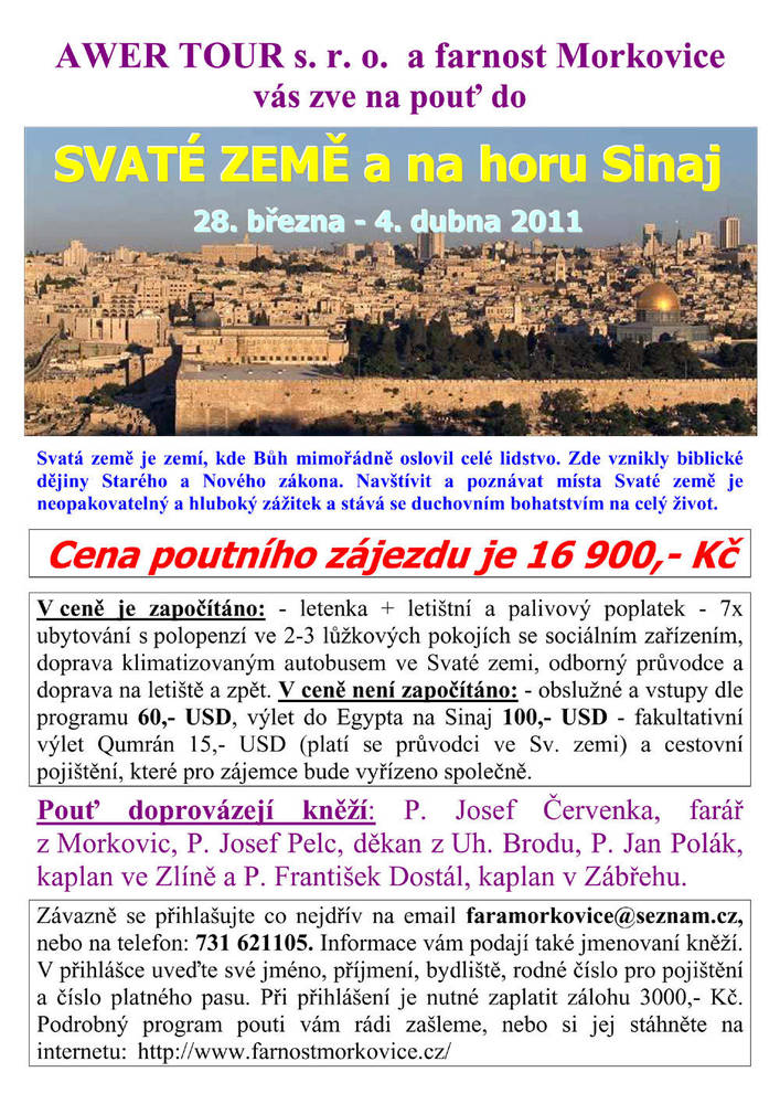 P. Josef Červenka, P. Josef Pelc, P. Jan Polák a P. František Dostál zvou na pouť do Svaté země, která se uskuteční v termínu 28. března – 4. dubna 2011.