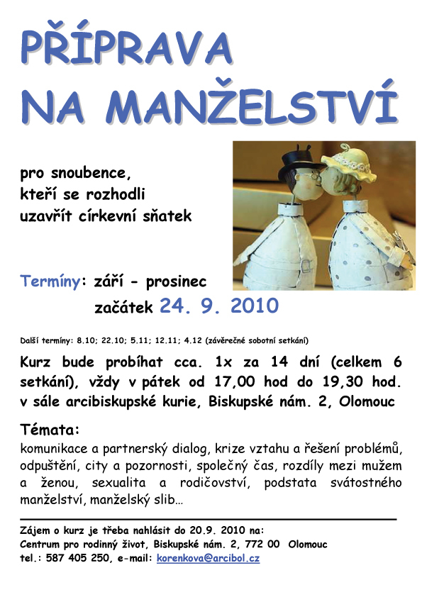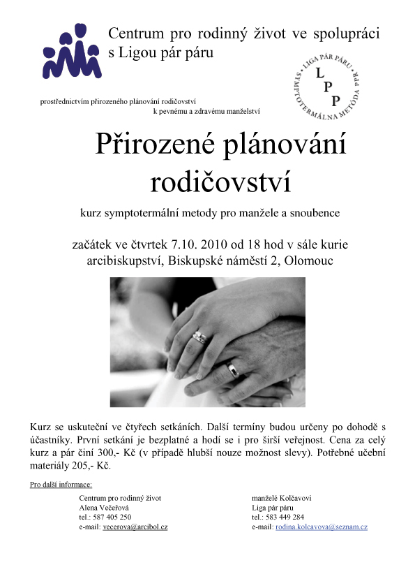 Olomoucké Centrum pro rodinný život rozjíždí podzimní běh kursu Příprava snoubenců na manželství. Začíná se 24. září 2010. Dalším tipem pro snoubence a manžele je kurs Přirozeného plánování rodičovství, ten začíná 7. října 2010.