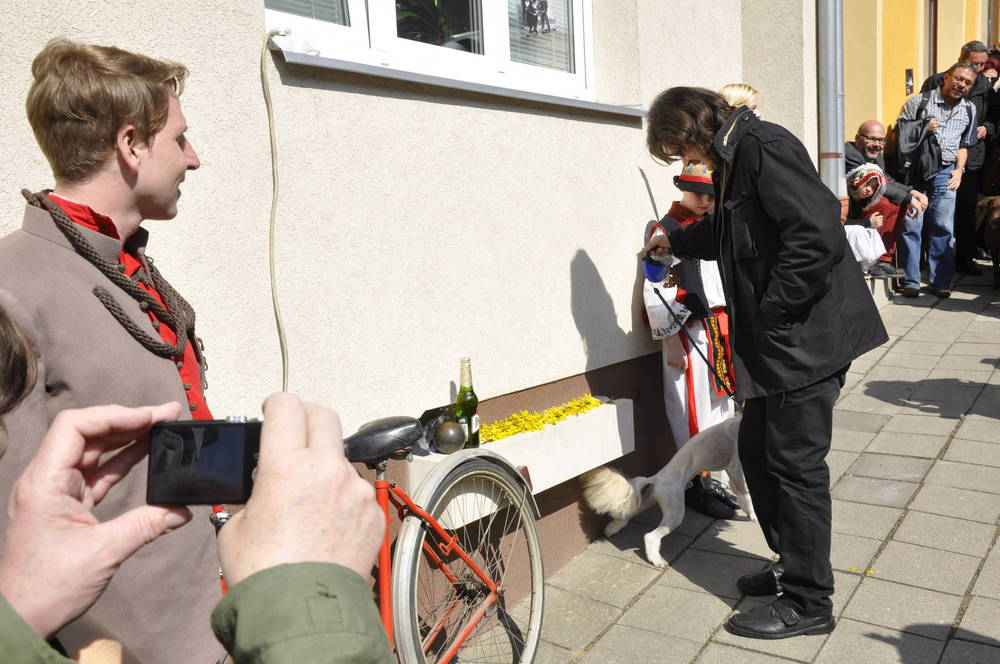Po chvíli se řečníci přesouvají k pamětní desce ve tvaru perličky, která je umístěna na rodném Hrabalově domě. Podle spisovatelova přání leží ve výšce, aby na ni mohli čurat psi. Po několika neúspěších místních psů se role ujímá jeden z herců, aby alespoň symbolicky pomocí plyšového psa a stříkačky s vodou „počural“ Hrabalovu pamětní desku. „První Hrabal, kterého jsem četl, byly Postřižiny. Po první větě jsem si řekl, to je něco, co jsem nikdy nečetl. Mám ho rád, protože v každém písmenku je radost ze života. Když ho čtu, připadám si jako v hospodě. Je tam prázdný stůl, sklenice a on mně říká všechny ty příběhy. Zároveň rád ty příběhy vypráví, nedělá pauzy. To je Hrabal,“ rozhovořil se o spisovatelově stylu jeden z přihlížejících. Hned v zápětí celý průvod pokračuje po silnici dál, aby alespoň symbolicky prošel Hrabalovými rodnými Židenicemi. Zdejší chodníky lemují spisovatelovy texty psané křídou. Mnohdy tvoří nekonečně dlouhé věty, které je možné od začátku do konce číst pouze tehdy, pokud dojdete až na konec ulice.