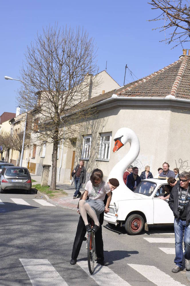 Scénu jako z Postřižin připomíná milenecký pár jedoucí na starém kole. Slečna sedí na řídítkách a pán v hnědém saku se snaží udržet rovnáhu. Kolo se tak potácí z jednoho konce silnice na druhý. Milenci však nepadají. Nakonec se přítomní dostávají na malé náměstíčko, kde je happening zakončen. Stěny přilehlé hospody, kam se část návštěvníků přesune, zdobí portréty Bohumila Hrabala. „Do poslední chvíle to byl precizně uvažující člověk. Já jsem ho zažil jako spolupracovníka, jako člověka, který logicky a přesně dokázal o divadle uvažovat. A nejenom o divadle. Byl to samozřejmě velice vzdělaný člověk. Takže pro mě to byl osobní, lidský, velikánský kontakt strávený v tvůrčím životě,“ zavzpomíná režisér a uvaděč Hrabalových her Ivo Krobot. A pak už jen docvakají poslední snímky fotoaparátů, přečte se poslední text a židenickým náměstím se rozhostí nezvyklé ticho. Jen z okolo stojících rozkvetlých stromů se pomalu na zem snášejí bělavé květiny.