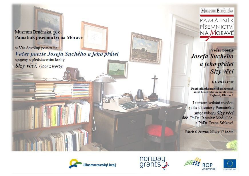 „Večer poezie Josefa Suchého a jeho přátel“ slibuje na páteční (6.6.) podvečer Památník písemnictví na Moravě v Rajhradě u Brna. V pracovně a knihovně Josefa Suchého na něj zavzpomíná jeho dcera Ivana Srbková. Literární odkaz tohoto po roce 1989 znovu objeveného autora připomene editor výboru „Slzy věcí“ Jaroslav Med. Pozvání platí na páteční 17. hodinu.